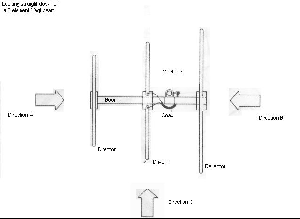The yagi is very simple. The basic yagi consists of three elements, as shown in figure 1. The middle element is an antenna you are already familiar with, the simple 1/2 wave dipole antenna. This element is generically called the "driven element". This is because this is the only element that is connected directly to the radio, it actually drives the whole antenna. The other two outer elements are generically called parasitic elements. One is called the Reflector and the other one is called the director element. These elements get their name from the job they do. The reflector reflects RF energy, the director directs RF energy. There is no magic circuit located inside the elements, they are simply straight rods! The reflector element is typically 5 % longer than the driven element and the director is typically 5 % shorted than the driven element. How it works. See figure 1. As signal A comes in it strikes all three elements hence generates a current on each element., the signals are re-radiated by the director and reflector and arrive at the driven element in-phase with one another (the two re-radiated signals and the original signal). This basically means, the signals reinforce each other...and make the incoming signal much stronger coming from direction A. When the signal comes from direction B and C, the same thing happens, except the signals arrive at the driven element out-of-phase with one another which simply means they cancel each other out, significantly reducing signals from direction B and C. This very useful effect (signals arriving in-phase/out-of-phase) is caused by the special spacing and length of the director and reflector element in relation to the driven element.