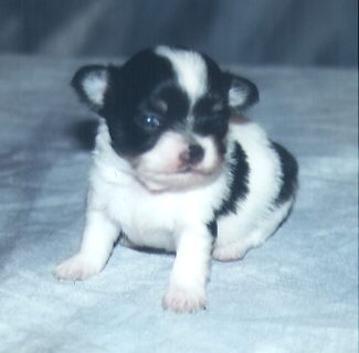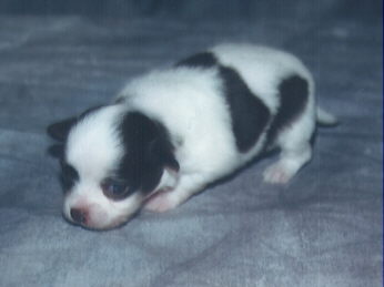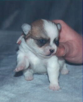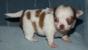 | Brown spotted on white male with brown nose, hazel eyes long coat Weight 8 oz $350.00 SOLD |