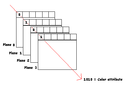 The EGA was next to come on the scene sporting up to sixteen colors onscreen. At sixteen colors, each pixel consumed 4 bits but they were not laid out in memory like CGA. While 16 colors were a lot better than 2 or 4, game programmer's still found it hard to generate stunning graphics so another mode came out on the horizon. Finally, the VGA came into existence and was a God send to many game programmer's, even to this day. Standard VGA graphics could display as many as 256 onscreen colors and had resolutions as high as 640x480. Of course, that kind of pales by today's high resolution 1024x800 at 16 million or more on screen colors. But for most games, it was more than enough to create realistic looking games. In order to maintain backwards compatibility with EGA, the VGA modes are mapped in a planar, rather than a linear fashion. This planar mode allows both the EGA and the VGA cards to be altered using memory locations A000:0000 to A000:FFFF. That's 64K of memory, however, it is possible to have EGA cards with more than 64K of video RAM and the VGA cards sport 256K or more. (The mainstream as of this writing is 1 to 4MB standard.) How can we address all this VRAM? The answer lies in its use of planes. This video RAM (VRAM) is accessed in chunks (planes) of up to 64K. Selecting a desired plane is accomplished using a plane select mask illustrated below.