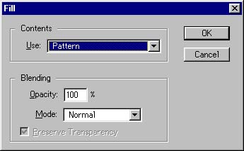3. Choose select>all. Then edit>define pattern. Then minimize or close the pattern and return to the image. Make sure preserve transparency is checked and then choose edit>fill with pattern. See the illustration below.