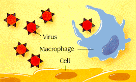 1 . The immune response begins when a white blood cell called a macrophage encounters a virus and consumes it. Meanwhile, other viruses look for nearby cells to infect.