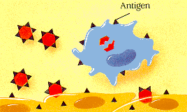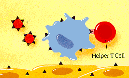 3 . Unique among the many different helper T cells (another class of white blood cells) in the body, one particular helper T cell now recognizes the antigen displayed and binds to the macrophage.