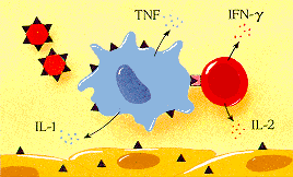 4 . This union stimulates the production of chemical substances -- such as interleukin-1 (IL-1) and tumor necrosis factor (TNF) by the macrophage, and interleukin-2 (IL-2) and gamma interferon (IFN-y) by the T cell -- that allow intercellular communication.