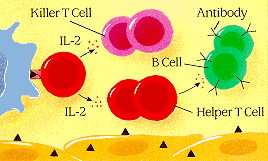 5 . As part of the continuing process, IL-2 instructs other helper T's and a different class of T cells, the killer T's, to multiply. The proliferating helper T's in turn release substances that cause B cells to multiply and produce antibodies.