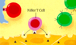 6 . The killer T cells now begin shooting holes in host cells that have been infected by viruses.