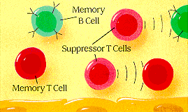 8 . Finally, as the infection is brought under control, the activated T and B cells are turned off by suppressor T cells. However, a few "memory cells" remain behind to respond quickly if the same virus attacks again. Cancer immunologists believe that the body fights cancer in much the same way it seeks to eliminate viruses. Further study of the immune system is expected to reveal ways to bolster it, allowing the body to become a more active partner in the fight against cancer.
