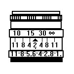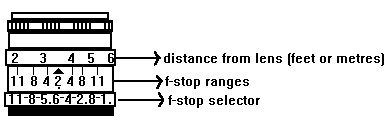 The bottom most ring selects the f-stop. The top most set of numbers is a group of distances (usually in both feet and metres) that moves with the lens. Assuming that the distances above are measured in feet, you will notice that if you set the aperature to f4 all objects between 3 and 4 feet will appear sharp. If you reduce the aperature size to f11 however, everything between 2 - 5 feet will appear in focus.