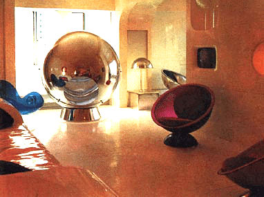 - many times, people who bought the chair had the insides fitted with stereo speakers. eero aarnio himself had one with telephones. but the most spectacular version of the chair that i've yet discovered was in the house of artist victor lukens. he made a spherical chair very similar to aarnio's in shape, but instead of fiberglass, he used one-way mirror. you could sit inside it and look out, but nobody could see you inside of it. admittedly extreme, but it went with the rest of his self-designed apartment filled with clear plastic furniture, white vinyl pillows, and white plastic walls with built-in compartments.