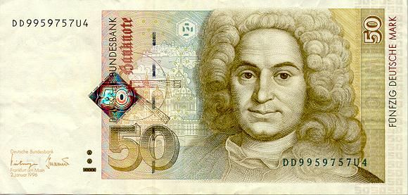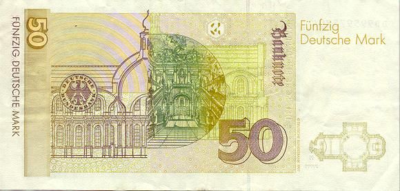 * When it is written, it appears as DM 50 with no dollar sign. * DM refers to Deutsche Mark just like the $ refers to the U.S. dollar. * When it is not an even mark amount, it is written DM 50,25 (notice the comma instead of the period). * The Deutsch Mark is always capitalized. * The larger the denomination, the larger the size of the bill...makes sense! |