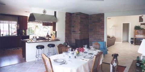 Looking from the door out to the pool, into what was the living room. This is now our dining room (with the fireplace).