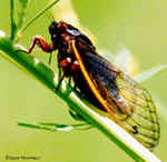 Dig out of the earth in the dark of night. We take our first breath of clear, outdoors air. But have a care: many will perish before even this night is out. I struggle to emerge from my shell and become a new creature. Bright red eyes and gold striped belly, shimmering wings edged with orange--festive colors for the time of celebration. My brave brothers and sisters, dry your wings…climb and fly!