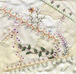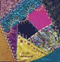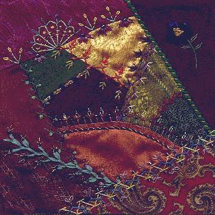 ![]() | Block Made for Karen Young The fan on this block is based on one in Dorothy Bond's Crazy Quilt Stitches. The blue flower is based on one that Kathi Larson put on her block for me. Click to see the block Karen made for me. |
