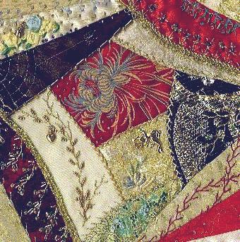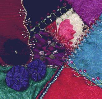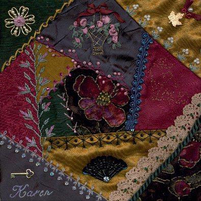 I'm really enjoying trading for these blocks. I get to see the work of so many wonderful needleworkers. The stitching ideas and motivation are great.I plan to make a wall hanging similar to the one that several members of the CrazyQuilt mailing list worked on last summer to thank our hosts Mike and Beth Ober at quiltropolis.com. I had the pleasure of putting the wall hanging together, and working with 19 great crazy quilt blocks. To find out more about the CrazyQuilt 6" Block Swap click here.