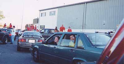 | Jessica and Joe peep out of the Volvo. |