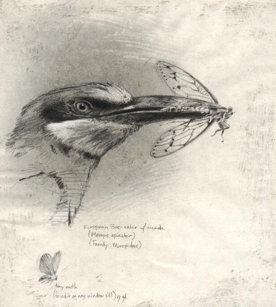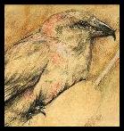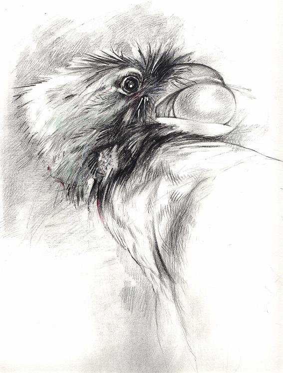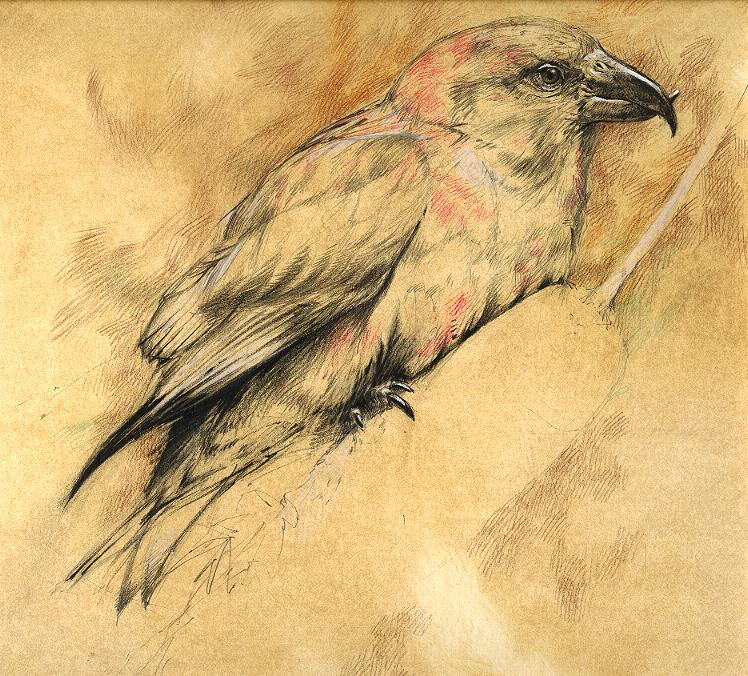 Crossbill finch mixed media drawing (Graphite, oil, color pencil, acrylic).