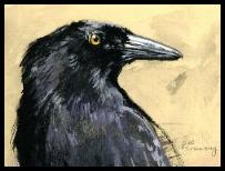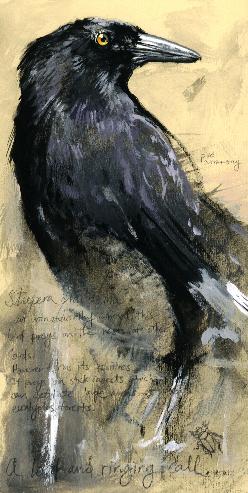 Austrailian Pied Currawong mixed media painting (watercolor, acrylic, and color pencil).