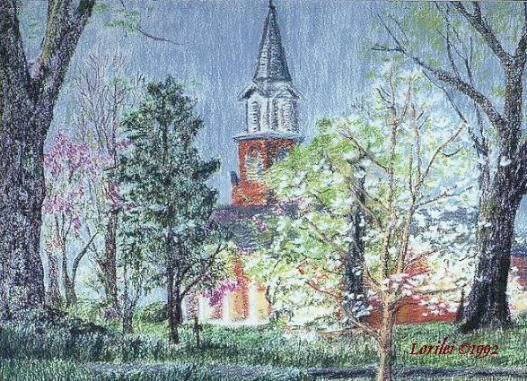 This drawing depicts Franklin's First Baptist Church. It was drawn in the spring, when a white flowering dogwood could be seen in the foreground.