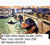 Derain, André (1880-1954), peintre français, l'une des figures majeures du fauvisme. Né à Chatou, André Derain étudia à l'académie Carrière de 1898 à 1899, où il fit la connaissance d'Henri Matisse puis, plus tard, de Maurice de Vlaminck. La visite de l'exposition Van Gogh à la galerie Bernheim jeune en 1901 le décida à abandonner définitivement ses études d'ingénieur pour se consacrer à la peinture. Ses premières œuvres, proches de celles de Gauguin, de Signac et de Cross, ouvrent la voie au fauvisme, que consacre le Salon d'automne de 1905. Durant cette période particulièrement créative, Derain se distingua par une grande audace dans l'emploi de la couleur, qu'il étale en larges touches segmentées!; les formes sont stylisées, déformées et le procédé de composition repose sur des perspectives originales, visibles dans ses vues de Londres (le Pont de Westminster, 1905, Paris) ou de Paris (les Deux Péniches, 1906, musée national d'Art moderne, Paris).