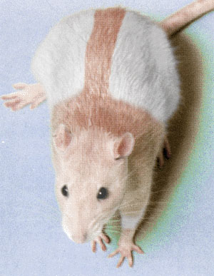 Now some of you out there might have heard about merle rats, which is a type of genetic variance where parts of the coat are lighter than others. Amazingly enough, I stumbled on a similar situation when I first bred ahairless rat to a normal coated agouti hooded rat. The off-spring had varied appearances, but two were remarkably different. They were what I now call merle heads. Their base coat color was white, and their markings were chocolate. But on their heads the color was tan. Sadly, my little male was a runt and was eaten by his littermates, but my female grew up to have several litters. I don't have any real pictures (I tried taking pictures of her, but they all came out fuzzy.), but I have an artist rendition of what one looks like. I'm going to try to take some pictures of her last litter, as she died not too long ago and I still have her children.