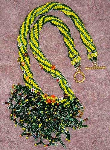 | This necklace is done in the African Helix stitch, accented with a stick fringe focal point design that features tiny beaded flowers. This necklace evokes memories of sunny, hot Texas summer afternoons. |