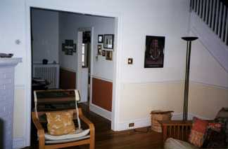 Now the left stereo speaker is craning its neck to the hard left. As you're looking into the dining room, the edge of the fireplace is visible.