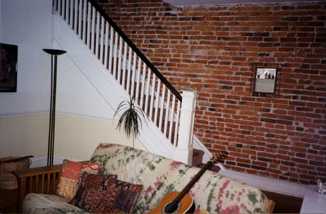 This is what the left stereo speaker sees upon looking diagonally across the living room. The brick wall is common to my neighbor and her dog, Mac.