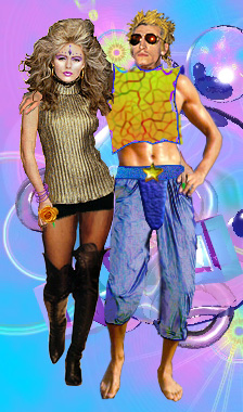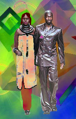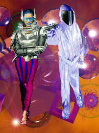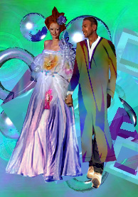 The bride don't have to wear white. This futuristic gown is for the brides of the coming millennium. The necklace is made of rubber, inspired by tires! He is more conservative in black satin. |