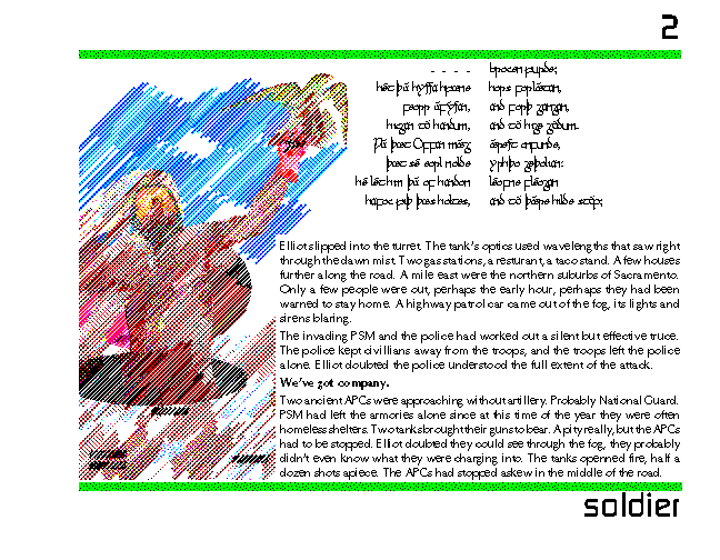 Elliot slipped into the turret. The tank's optics used wavelengths that saw right through the dawn mist. Two gas stations, a resturant, a taco stand. A few houses further along the road. A mile east were the northern suburbs of Sacramento. Only a few people were out, perhaps the early hour, perhaps they had been warned to stay home. A highway patrol car came out of the fog, its lights and sirens blaring.