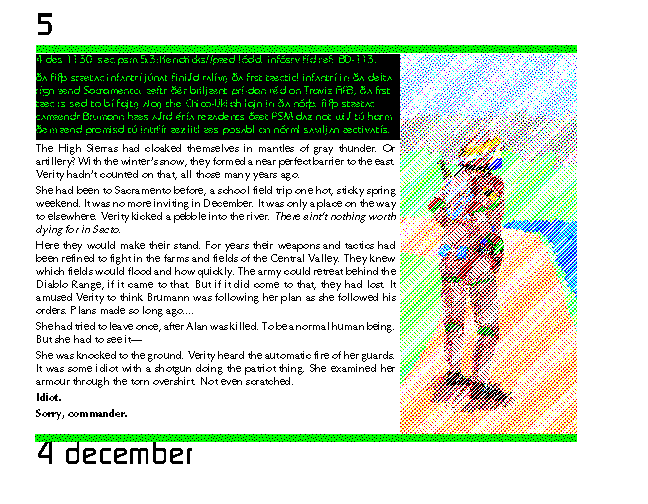 Here they would make their stand. For years their weapons and tactics had been refined to fight in the farms and fields of the Central Valley. They knew which fields would flood and how quickly. The army could retreat behind the Diablo Range, if it came to that. But if it did come to that, they had lost. It amused Verity to think Brumann was following her plan as she followed his orders. Plans made so long ago....