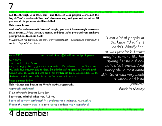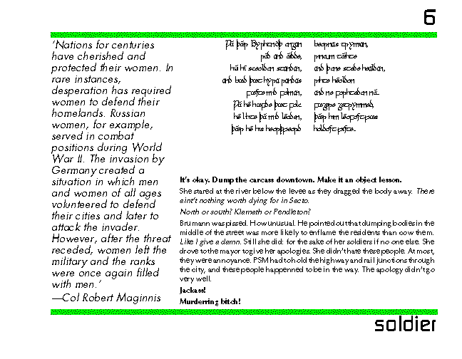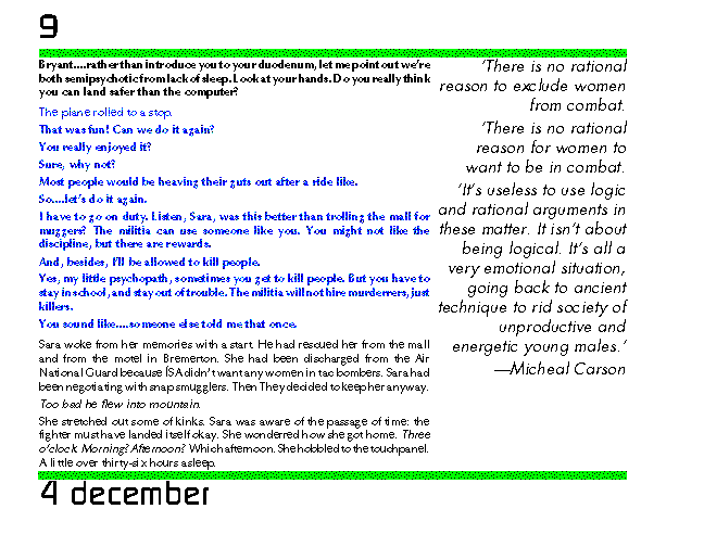 Sara woke from her memories with a start. He had rescued her from the mall and from the motel in Bremerton. She had been discharged from the Air National Guard because ISA didn't want any women in tac bombers. Sara had been negotiating with snap smugglers. Then They decided to keep her anyway.