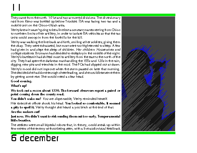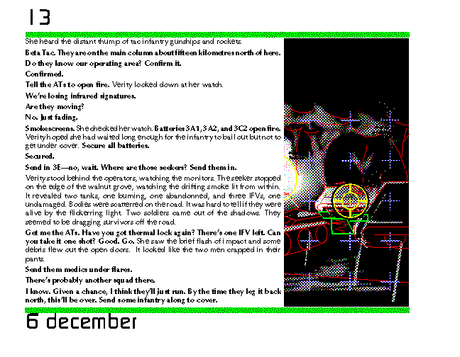 Verity was walking the line back and forth, smiling at her soldiers, giving them the okay. They were exhausted, but most were too frightenned to sleep. A few had given in and slept the sleep of children. Her children. Housewives and college students. Brumann had decided to redeploy in the middle of the night. Verity's battleunit had shifted most its artillery from the east to the north of the city. They had spent the darkness manhandling the 55s and 120s in the rain, digging new pits and trenches in the mud. The FOs had slipped out at dawn.