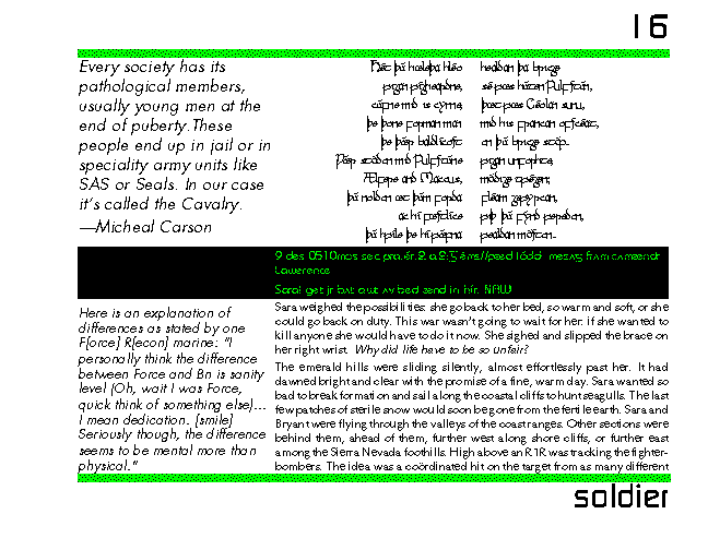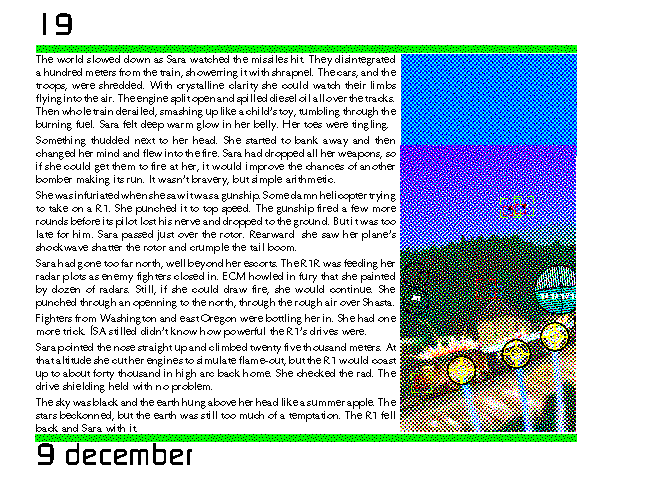 The world slowed down as Sara watched the missiles hit. They disintegrated a hundred meters from the train, showerring it with shrapnel. The cars, and the troops, were shredded. With crystalline clarity she could watch their limbs flying into the air. The engine split open and spilled diesel oil all over the tracks. Then whole train derailed, smashing up like a child's toy, tumbling through the burning fuel. Sara felt deep warm glow in her belly. Her toes were tingling.