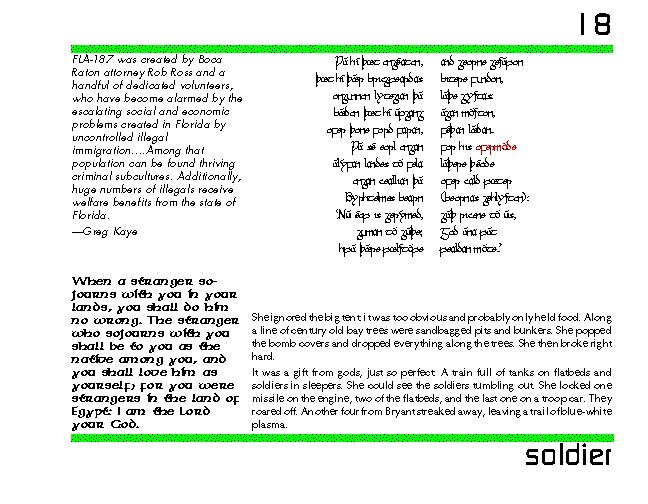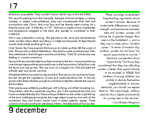 The emerald hills were sliding silently, almost effortlessly past her. It had dawned bright and clear with the promise of a fine, warm day. Sara wanted so bad to break formation and sail along the coastal cliffs to hunt seagulls. The last few patches of sterile snow would soon be gone from the fertile earth. Sara and Bryant were flying through the valleys of the coast ranges. Other sections were behind them, ahead of them, further west along shore cliffs, or further east among the Sierra Nevada foothills. High above an R1R was tracking the fighter-bombers. The idea was a coordinated hit on the target from as many different directions as possible. They wouldn't know which way to fire the SAMs.