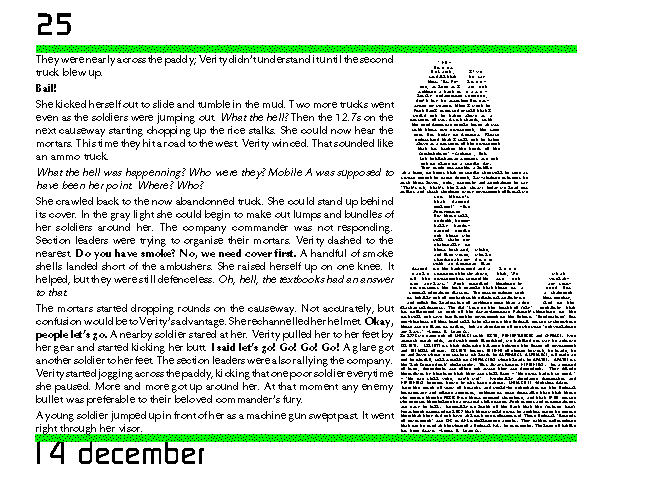 She crawled back to the now abandonned truck. She could stand up behind its cover. In the gray light she could begin to make out lumps and bundles of her soldiers around her. The company commander was not responding. Section leaders were trying to organise their mortars. Verity dashed to the nearest. Do you have smoke? No, we need cover first. A handful of smoke shells landed short of the ambushers. She raised herself up on one knee. It helped, but they were still defenceless. Oh, hell, the textbooks had an answer to that.