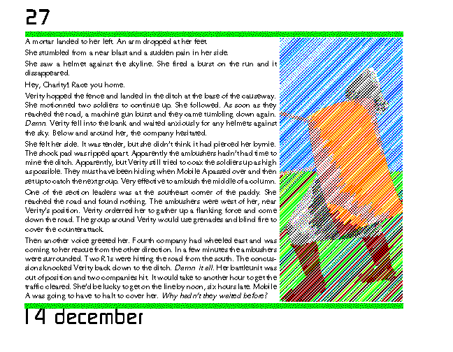 Verity hopped the fence and landed in the ditch at the base of the causeway. She motionned two soldiers to continue up. She followed. As soon as they reached the road, a machine gun burst and they came tumbling down again. Damn. Verity fell into the bank and waited anxiously for any helmets against the sky. Below and around her, the company hesitated.