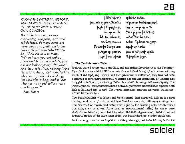 The Pacific Militia was larger and better armed than expected, hidden in secret underground military bases, what they referred to as mosses, military operating sites. The existence of mosses had been camoflaged by the building of buried technical operating sites, or tosses. Advertised as environmental relief, the tosses were revealed for the deceptions that they were. The federal government tried to control the proliferation of the subterrean cities, but Pacific had just evaded regulators.