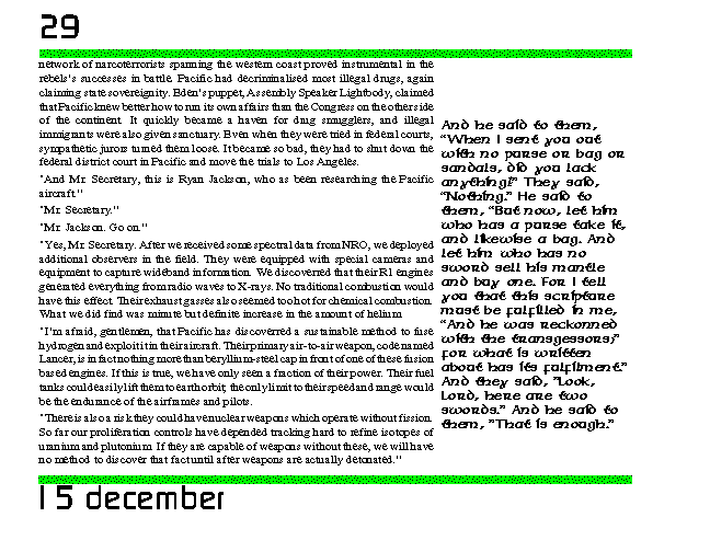 Jackson might not be an expert in military strategy, but even he suspected the network of narcoterrorists spanning the western coast proved instrumental in the rebels's successes in battle. Pacific had decriminalised most illegal drugs, again claiming state sovereignity. Eden's puppet, Assembly Speaker Lightbody, claimed that Pacific knew better how to run its own affairs than the Congress on the other side of the continent. It quickly became a haven for drug smugglers, and illegal immigrants were also given sanctuary. Even when they were tried in federal courts, sympathetic jurors turned them loose. It became so bad, they had to shut down the federal district court in Pacific and move the trials to Los Angeles.