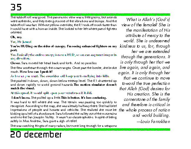 The takeoff roll was good. The panoramic view was a little grainy, but sounds were authentic, and they even got some of the vibrations and bumps. And the takeoff roll was fast. Without yellow overrides, the R1 took off much faster than it could have with a human inside. She looked to her left where patrol fighters orbitted.