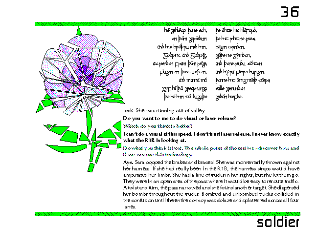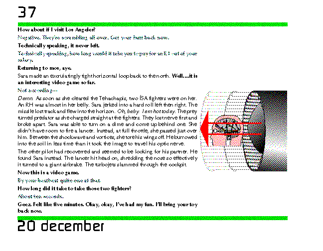 Damn. As soon as she cleared the Tehachapis, two ISA fighters were on her. An RH was almost in her belly. Sara jerked into a hard roll left then right. The missile lost track and flew into the horizon. Oh, baby. I am hot today. The prey turned predator as she charged straight at the fighters. They lost nerve first and broke apart. Sara was able to turn on a dime and come up behind one. She didn't have room to fire a lancer. Instead, at full throttle, she passed just over him. Between the shockwave and vortices, she tore his wings off. He burrowed into the soil in less time than it took the image to travel his optic nerve.