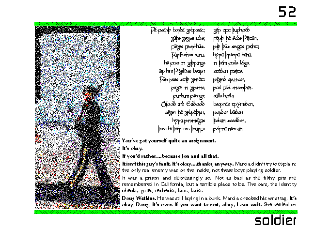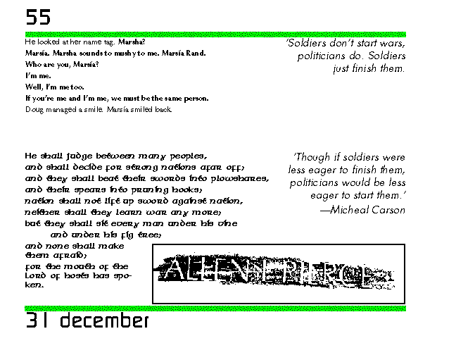 It isn't this guy's fault. It's okay....thanks, anyway. Marcia didn't try to explain: the only real enemy was on the inside, not these boys playing soldier.
