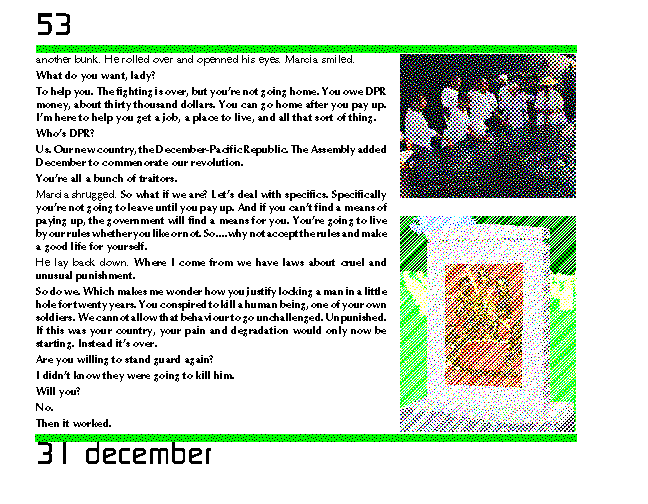 Marcia shrugged. So what if we are? Let's deal with specifics. Specifically you're not going to leave until you pay up. And if you can't find a means of paying up, the government will find a means for you. You're going to live by our rules whether you like or not. So....why not accept the rules and make a good life for yourself.