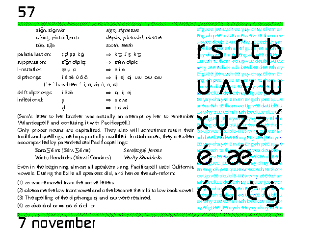 In this basic system, dipthongs are spelled with a vowel and semivowel, such bij bee, bow beau, and baw bough. Stress is marked with a grave accent (`), and syllabisation of mnnGlr are sometimes marked with (.). However the system is intended as a morphonemic representation rather than strictly phonemic or phonetic, and so various superfixes and subfixes are added to glyphs to modify their values. And a morpheme can retain its basic spelling in different contexts.