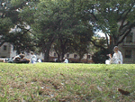 Echando la hueva: frente a la torre de la universidad, está six pack, que es un conjunto de seis edicifios de facultades instalados en torno a este mini prado (el nombre viene de la manera gringa de denominar a las cervezas en lata cuando vienen en grupos de seis). Acá todo el mundo se queda echando la hueva, durmiendo o tomando sol entre las clases. Algunos juegan freesbee (¿se escribe así?), otros leen, otras tocan música medieval y cuentan chistes. Acá no se ve, pero sentado desde acá se puede ver el Capitolio, la sede del gobierno del estado de Texas (Austin es la capital del Estado), cuya cúpula es identica a la del verdadero Capitolio que hay en Washington, aunque acá se cachetonean porque esta es seis metros más alta.