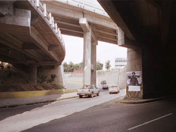 Luego les siguieron, mi favorito, el que estaba en el paso a desnivel de Tecún Umán y el que estaba colgando en el puente del Trébol. Este último lo quitaron dos hombres a eso de las 23:30 hrs. Yo pasaba por causalidad cerca y algo me dijo que fuera a ver y cabal, allí estaban metiendo sus manotas entre la baranda del puente, tratando de alcanzarlo. Me dió gusto ver sus caras descompuestas, ver que les estaba costando. Por fin supongo que lograron jalarlo y desaparecerlo como a muchos guatemaltecos a quienes estos ángeles representan. Al día siguiente pase por el lugar y solo quedaba su ausencia. Volviendo al ángel de Tecún Umán, este como dije era mi favorito porque el lugar donde estaba es muy especial. Uno se siente en un mundo subterráneo al estar allí, como en una catedral urbana y profana donde habita el ruido y el miedo. Al verlo, el ángel parecía haber llegado a refugiarse de sus perseguidores. Estuvo seguro por unos días, asechando y sorprendiendo a todos los que pasaban. Cuando uno se desplaza viniendo por el boulevard "liberación" hacia el Trébol, hay una sensación de vértigo cuando se empieza a bajar para pasar debajo de los puentes. La velocidad es de 90 Kms. por hora más o menos y de pronto allí estaba gritando su reclamo. Si uno seguía recto, la visión era muy rápida y paralela, pero si cruzaba a la izquierda, como iyendo hacia los museos, el ángel pasaba frente a los ojos. De noche era todavía más sorprendente cuando se iluminaba con la luz de los carros. Este era, sin duda, el lugar más mágico de todos.