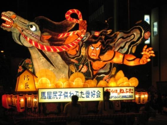 Many floats depict samurai or other warriors, royalty or esteemed animals like dragons or tigers. Below is a warrior on a horse. You can see the bamboo frame on the horsefs
