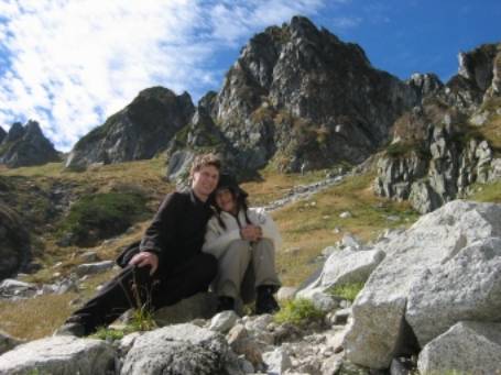 partway through the hike back down from the plateau. Behind us is the chunk of rock one