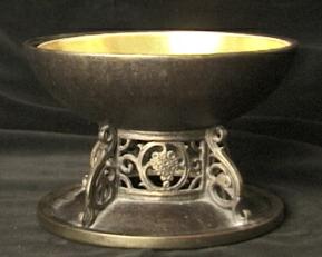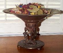 Oscar Bach Compote. Patinated footed compote features a 3 rams surmounted by a bronze ?dore flared bowl. | ||