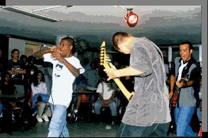 Quer um pouco mais de diversão e multimídia? Então visite também nossa página com Real Audio de algumas das bandas abaixo! A banda foi formada há um ano e meio atrás por Guto (Vocal), Lídio (Guitarra), Eduardo (Baixo) e Edgar(Bateria) na Cidade de Deus. Uma vez formado o grupo, bastaram três ensaios para compor as oito músicas de sua primeira demo: MRV (Menor, Revoltado e Viciado). A repercussão foi imediata e a mistura de hardcore e hip hop do Zomba foi conquistando espaço. A banda se apresentou no Bar da Rosa, CEFET, UFF, Teatro de Lona, CEAC, SESC do Engenho de Dentro, Museu da República e mais recentemente no Garage, com o CAOS.O grupo também foi convidado pelo escritor Paulo Lins para tocar no lançamento do livro "Cidade de Deus", traduzindo em música a realidade daquele romance. Durante os meses de Abril e Maio de 98, o Zomba entrou em estúdio para gravar o seu primeiro CD: "Caboclo de Pés no Chão". Patrocinados pelo poeta e ator Édson Veóca, a banda desenvolveu uma linha de divulgação baseada na venda de fitas demo e distribuição do CD em rádios.O novo trabalho segue a mesma linha do anterior, com músicas velozes e influências de Sepultura a Zé Ramalho. Todas as letras foram criadas por Guto, um legítimo poeta do submundo: "Revoltado e viciado/ viciado e ladrão, dentes afiados/ para viver no mundo cão" ("MRV").