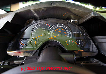 | The Firehawk instrument cluster is assembled in 2 parts: The clear front bezel and the rear gauge assembly. Two snap clips hold both together at the top and it is very easy to separate the two. At this point, I used a can of "Dust Off" to thoroughly clean my gauge face of any dirt or debris. You will also want to wash your hands at this point to avoid putting any fingerprints of dirt onto the gauge overlays. |