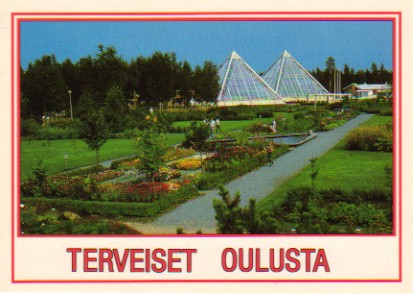 | If the weather is nice, we can go outside and up the road to the lovely Oulu University Botanical Gardens. Pictured here are Romeo and Juliet, the university's pyramid-inspired greenhouses. | ![]()  |